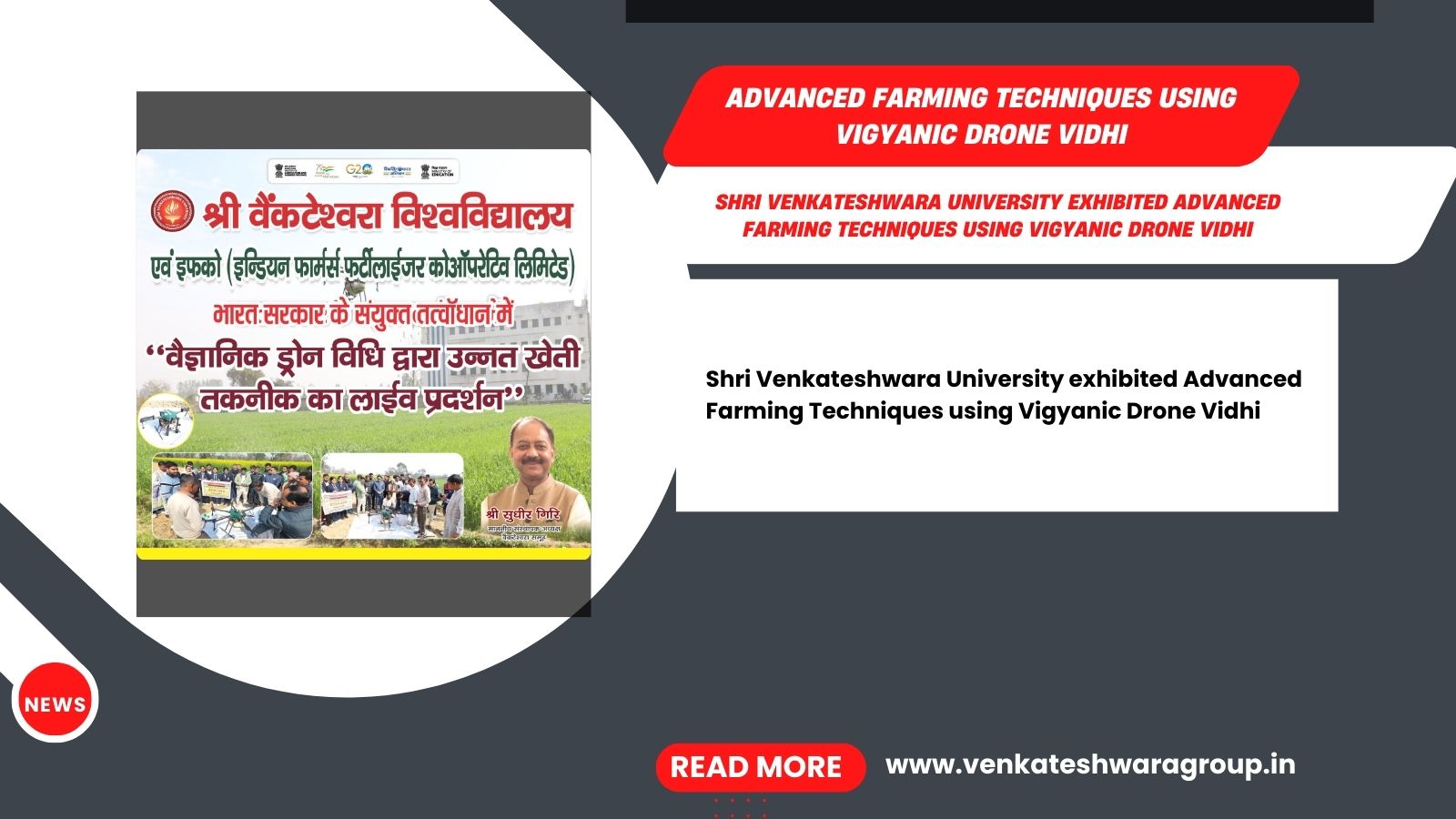Shri Venkateshwara University, in collaboration with IFFCO (Indian Farmers Fertilizer Co. Ltd) displayed advanced farming techniques using Vigyanic Drone Vidhi.